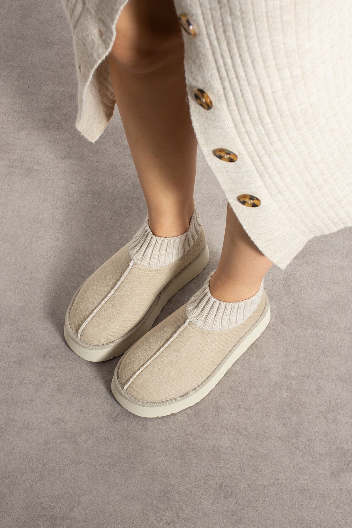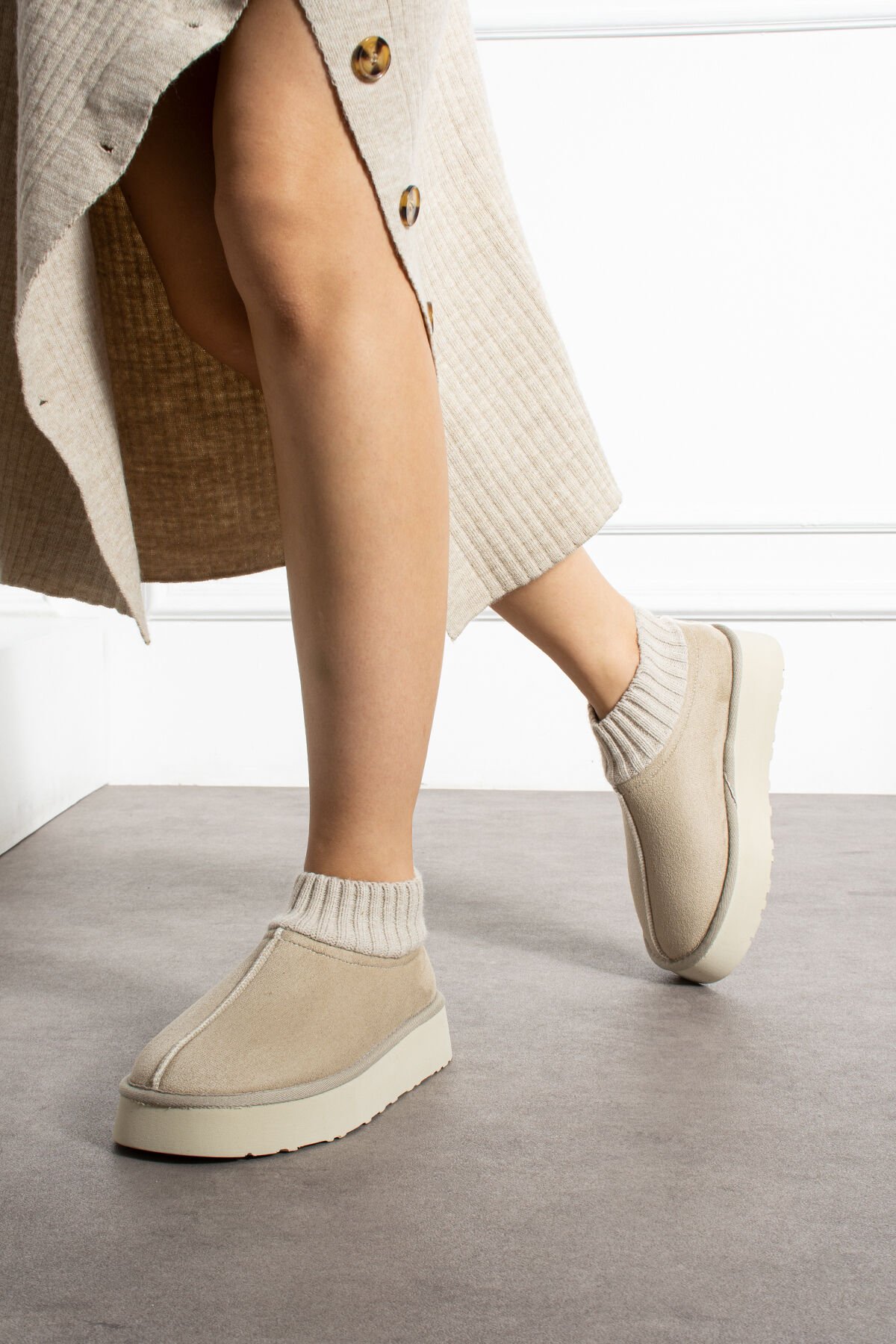 Topuk yüksekliği 4cm; Tam kalıptır kendi numaranızı almanız tavsiye edilir; Türkiye'de üretilmiştir; Materyal: Süet; İç kısım kürklü; Modelin giydiği ürün 37 numaradır; Termo tabandır kaymaya karşı dirençlidir