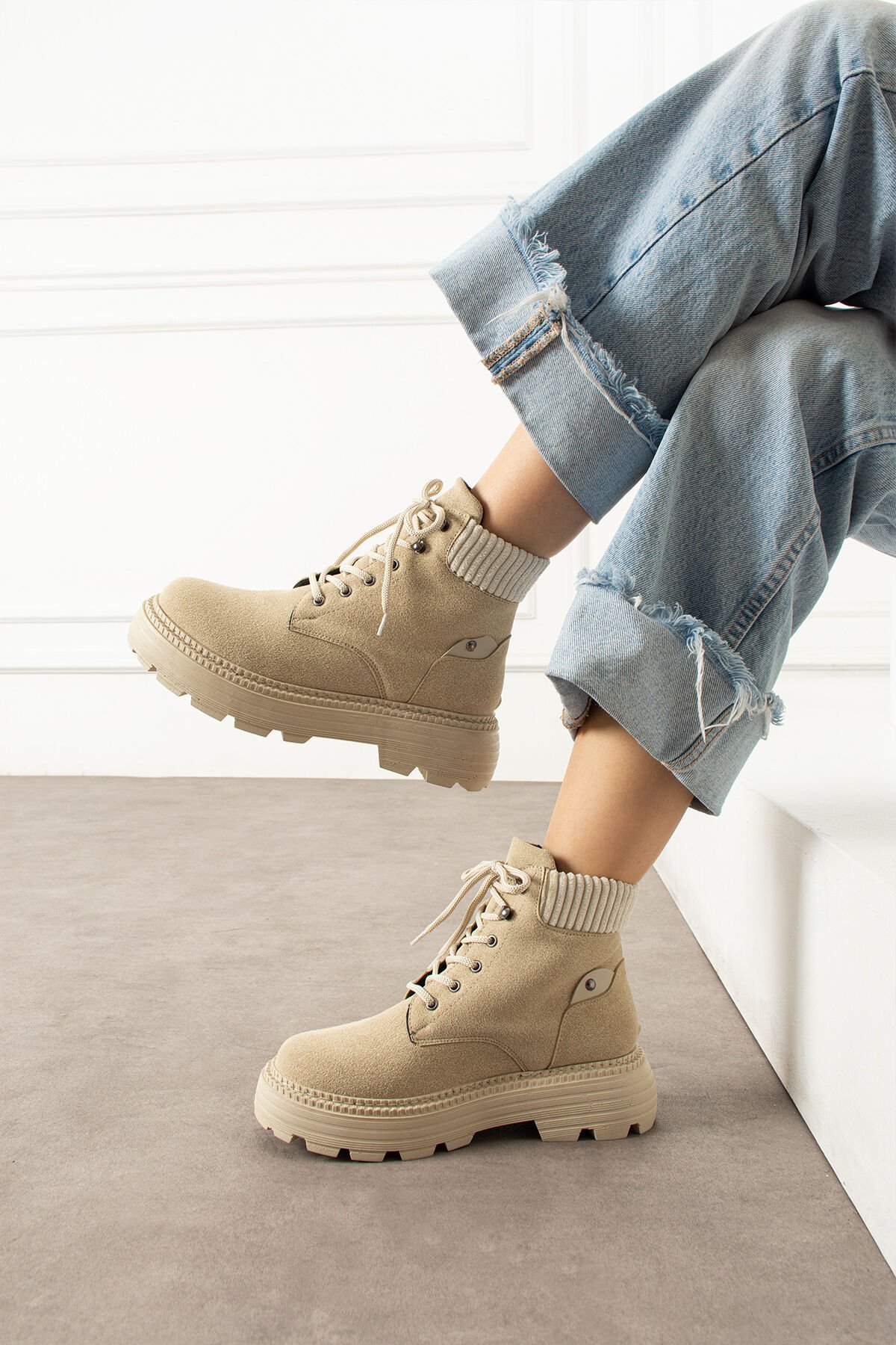 Türkiye'de üretilmiştir; Tam kalıptır kendi numaranızı almanızı tavsiye ederiz; Termo tabandır kaymaya karşı dirençlidir; Dışı: Kaliteli süet görünümlü kumaş; Sezon: Sonbahar / Kış; Geniş paça kotlar veya oversize kazaklarla günlük stiline enerjik bir dokunuş kat!; Sıcak tutan triko bilek detayı ve modern kalın tabanı ile hem konforlu hem de şık bir görünüm sunar.; Sıcak tutan triko bilek detayı ve modern kalın tabanı ile hem konforlu hem de şık bir görünüm sunar.