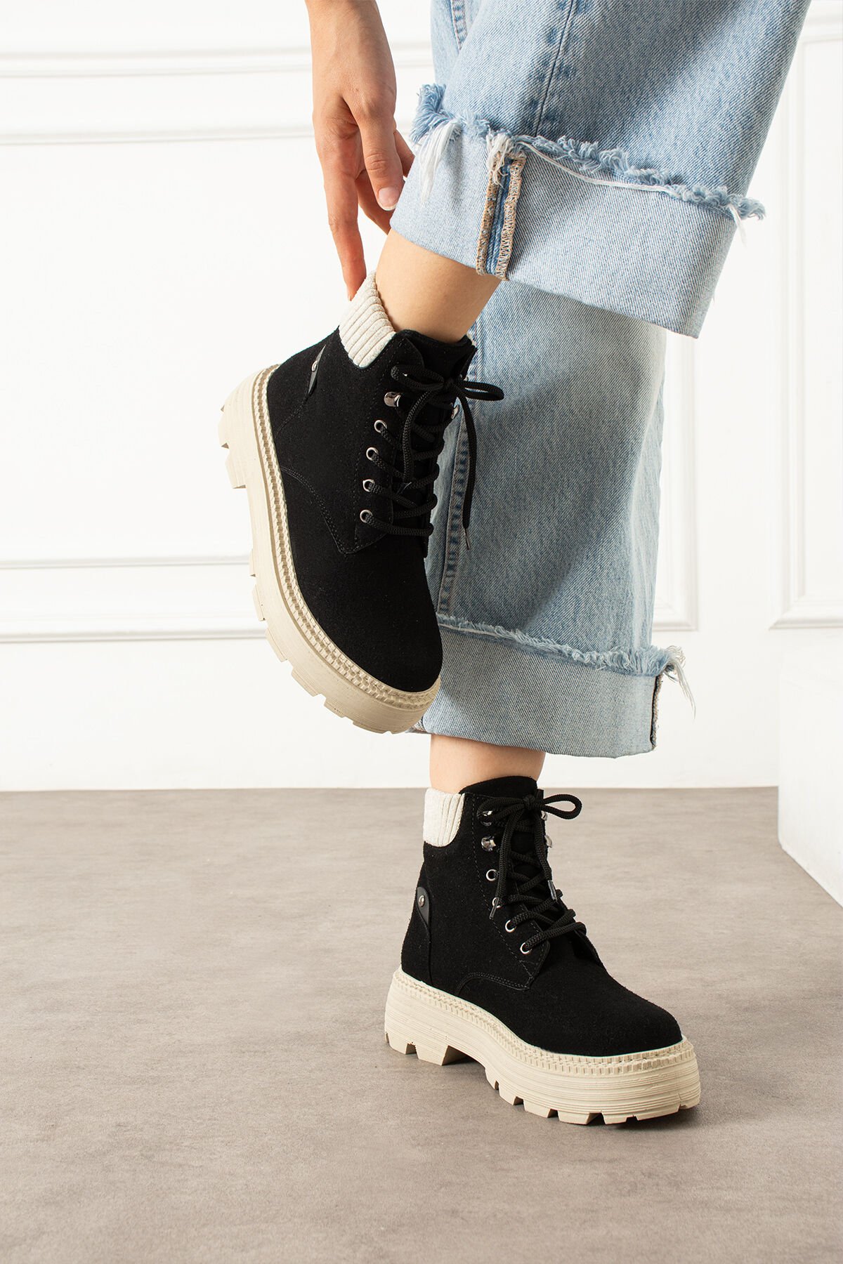 Türkiye'de üretilmiştir; Tam kalıptır kendi numaranızı almanızı tavsiye ederiz; Termo tabandır kaymaya karşı dirençlidir; Dışı: Kaliteli süet görünümlü kumaş; Sezon: Sonbahar / Kış; Geniş paça kotlar veya oversize kazaklarla günlük stiline enerjik bir dokunuş kat!; Sıcak tutan triko bilek detayı ve modern kalın tabanı ile hem konforlu hem de şık bir görünüm sunar.; Sıcak tutan triko bilek detayı ve modern kalın tabanı ile hem konforlu hem de şık bir görünüm sunar.