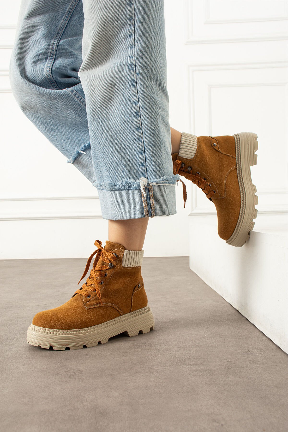 Türkiye'de üretilmiştir; Tam kalıptır kendi numaranızı almanızı tavsiye ederiz; Termo tabandır kaymaya karşı dirençlidir; Dışı: Kaliteli süet görünümlü kumaş; Sezon: Sonbahar / Kış; Geniş paça kotlar veya oversize kazaklarla günlük stiline enerjik bir dokunuş kat!; Sıcak tutan triko bilek detayı ve modern kalın tabanı ile hem konforlu hem de şık bir görünüm sunar.; Sıcak tutan triko bilek detayı ve modern kalın tabanı ile hem konforlu hem de şık bir görünüm sunar.