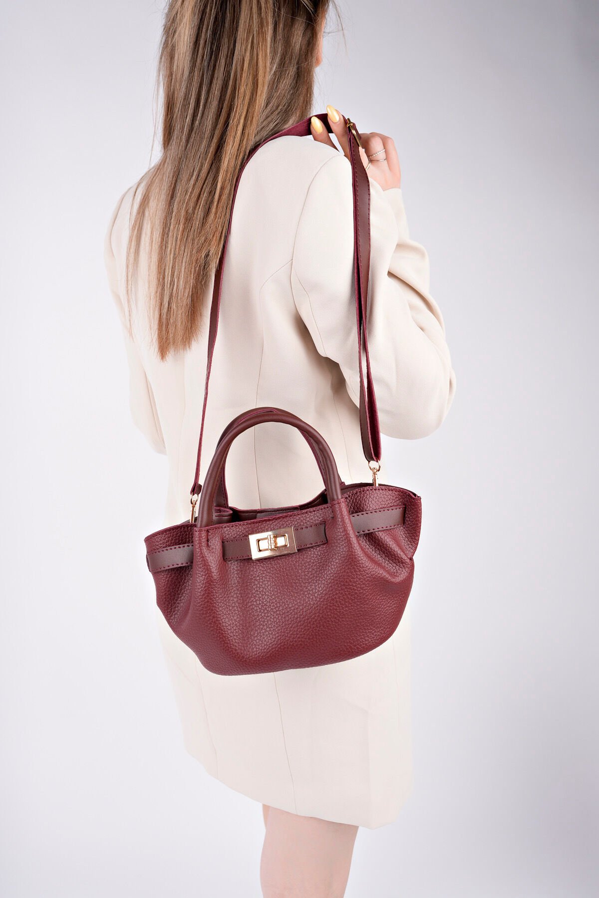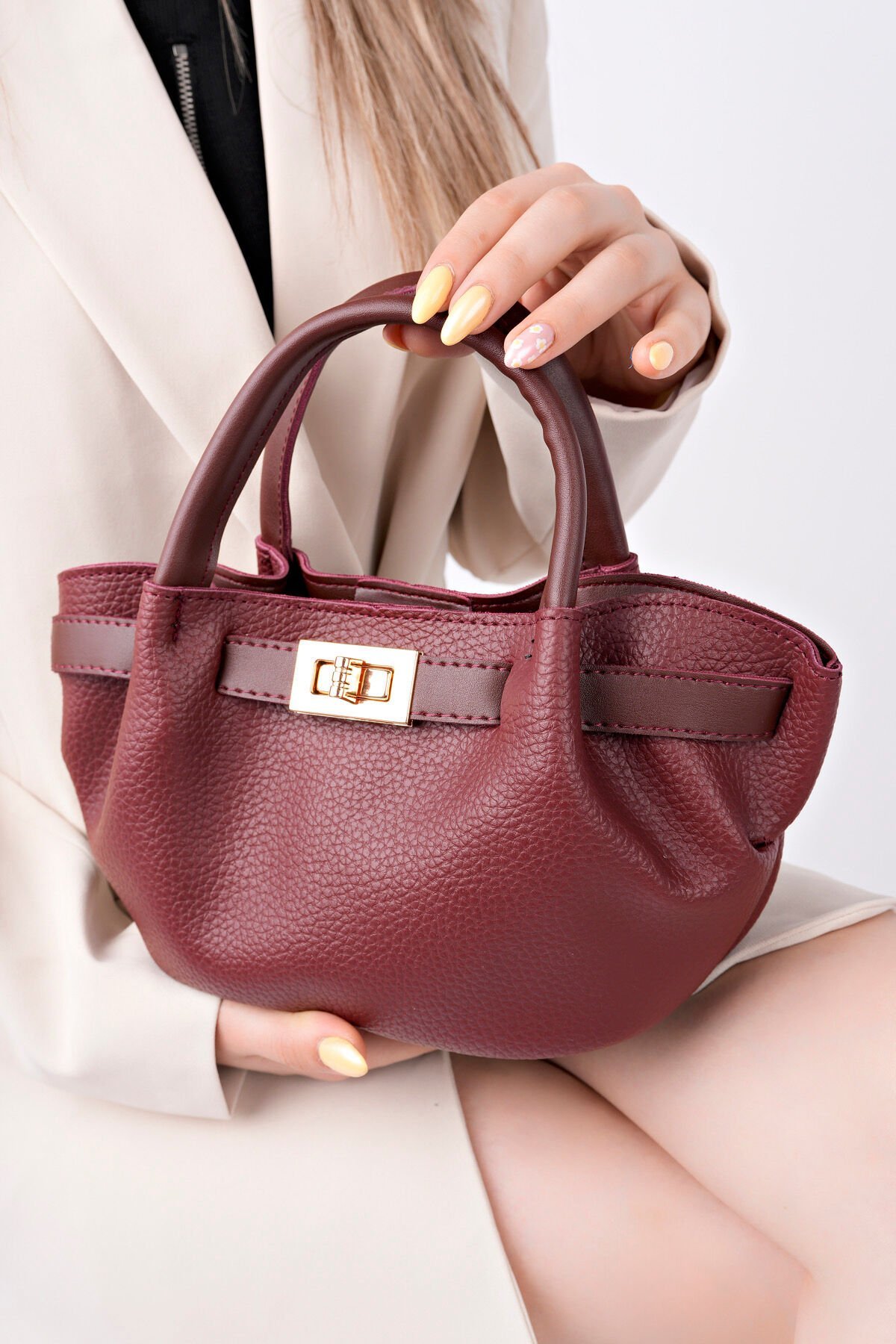 Kadın Şık Mini El Çantası - Deri Dokulu Solina, modern şehir hayatında hem gündüz hem akşam şıklığını tamamlayan pratik bir el çantası alternatifidir.