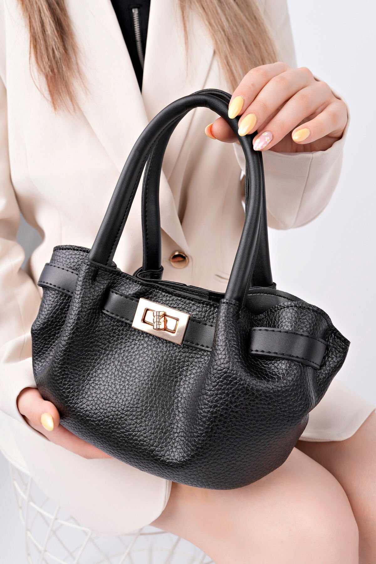 Deri dokulu dış yüzey; Altın renk metal toka detayı; İç astarlı ana bölme; Elde taşımaya uygun kısa sap tasarımı; Günlük ve şık kombinlerle uyumlu