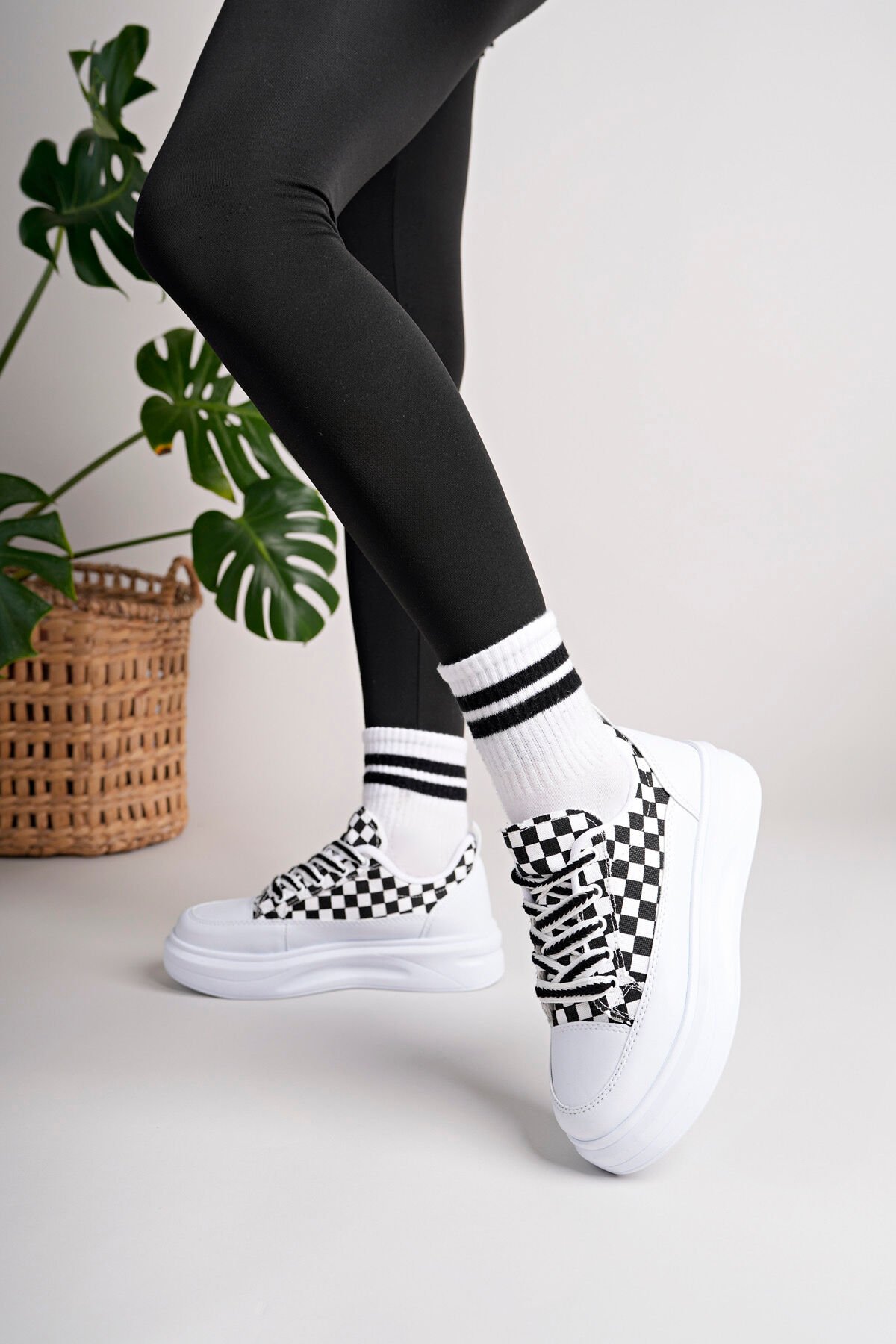 Kadın Yüksek Taban Dama Desenli Günlük Ayakkabı Beyaz Siyah - 36