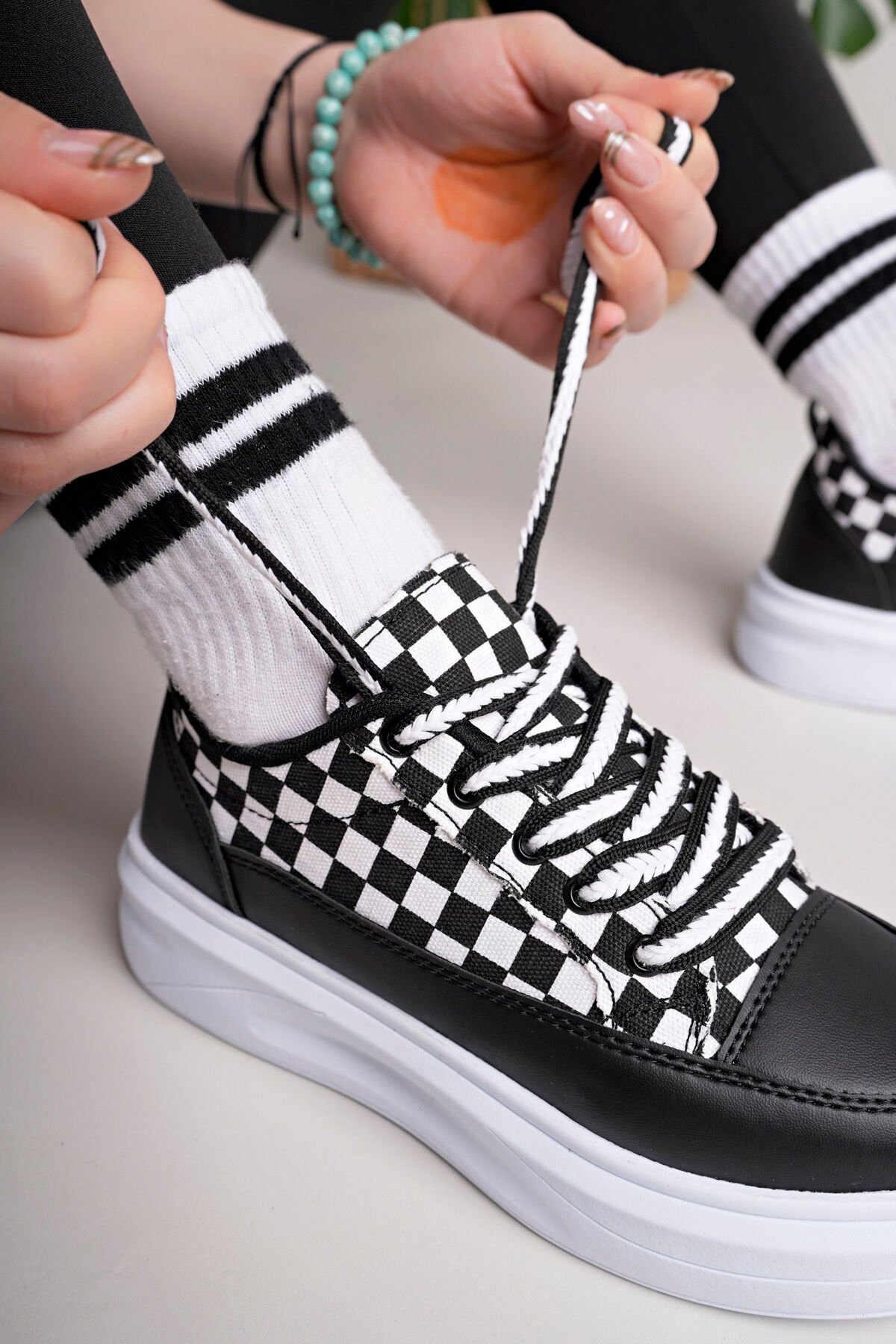 Kadın Yüksek Taban Dama Desenli Günlük Ayakkabı, basic ve casual koleksiyon trendlerine uyumlu yapısıyla hem sade hem iddialı bir görünüm sunar. Sezonun trend taban tasarımı sayesinde günlük hayatın her anında rahatlıkla kullanılabilir, şehirli kadının gardırobunda modern bir alternatif olur.